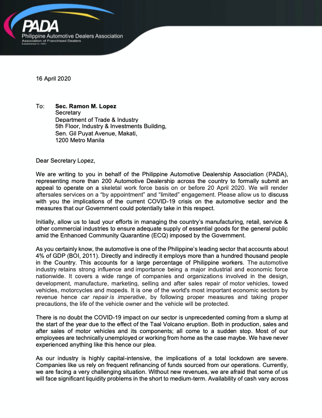 The Philippine Automotive Dealers Association (PADA) has made an urgent appeal to the Department of Trade and Industry (DTI) to allow them to re-open on a skeletal workforce basis by this week for aftersales service and parts sales.