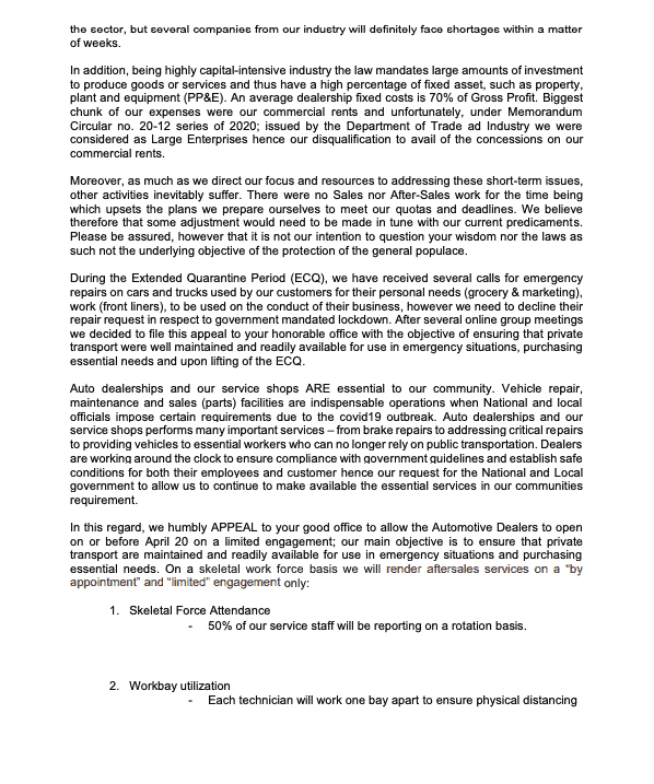 For PADA’s part, they’re appealing to the DTI to allow them to re-open on “by appointment” and “limited” engagement for aftersales service and parts sales with the following conditions: