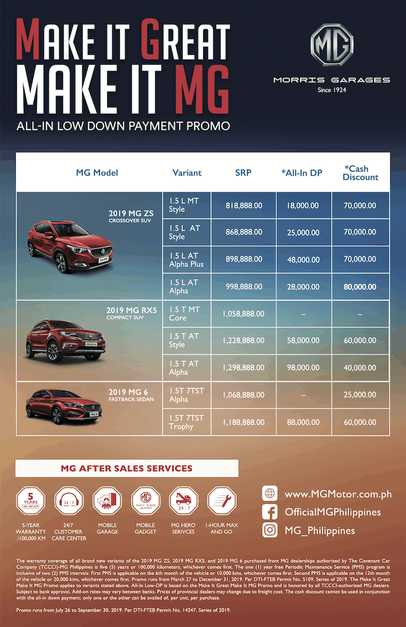 The need for a great all-around experience with a car purchase is what fuels MG Philippines to offer its “Make it Great, Make it MG” promo. Until the end of September, car buyers can avail of great deals on all MG cars and take advantage of the numerous perks associated with owning an MG.