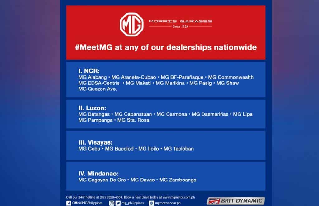 These vehicles and their respective model variants are currently available at any of the 24 MG dealerships nationwide. These are MG Alabang, MG Araneta-Cubao, MG BF Parañaque, MG Commonwealth, MG EDSA Centris, MG Makati, MG Marikina, MG Pasig, MG Shaw, MG Quezon Avenue, MG Batangas, MG Cabanatuan, MG Carmona, MG Dasmariñas, MG Lipa, MG Pampanga, MG. Sta. Rosa, MG Cebu-Mandaue, MG Bacolod, MG Iloilo, MG Tacloban, MG Cagayan De Oro, MG Davao, and MG Zamboanga.