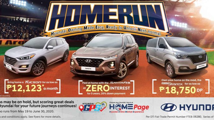 With Hyundai’s HOMERUN, getting the dynamic ride of your dreams is affordable and easy even in our new normal way of life. The ever-hardworking Tucson, known for its thrilling performance and impressive fuel efficiency, can be yours for as low as P12,123 a month. Hyundai’s premium seven-seater that’s engineered for a refined riding and driving experience, the Santa Fe, can be yours at zero interest for 5 years, and for as low as 20% down payment only! And, last but not the least, the Grand Starex, a favorite of Filipino families (and celebrities) due to its modern premium comfort and amenities, can be yours for as low as Php18,750 down payment.