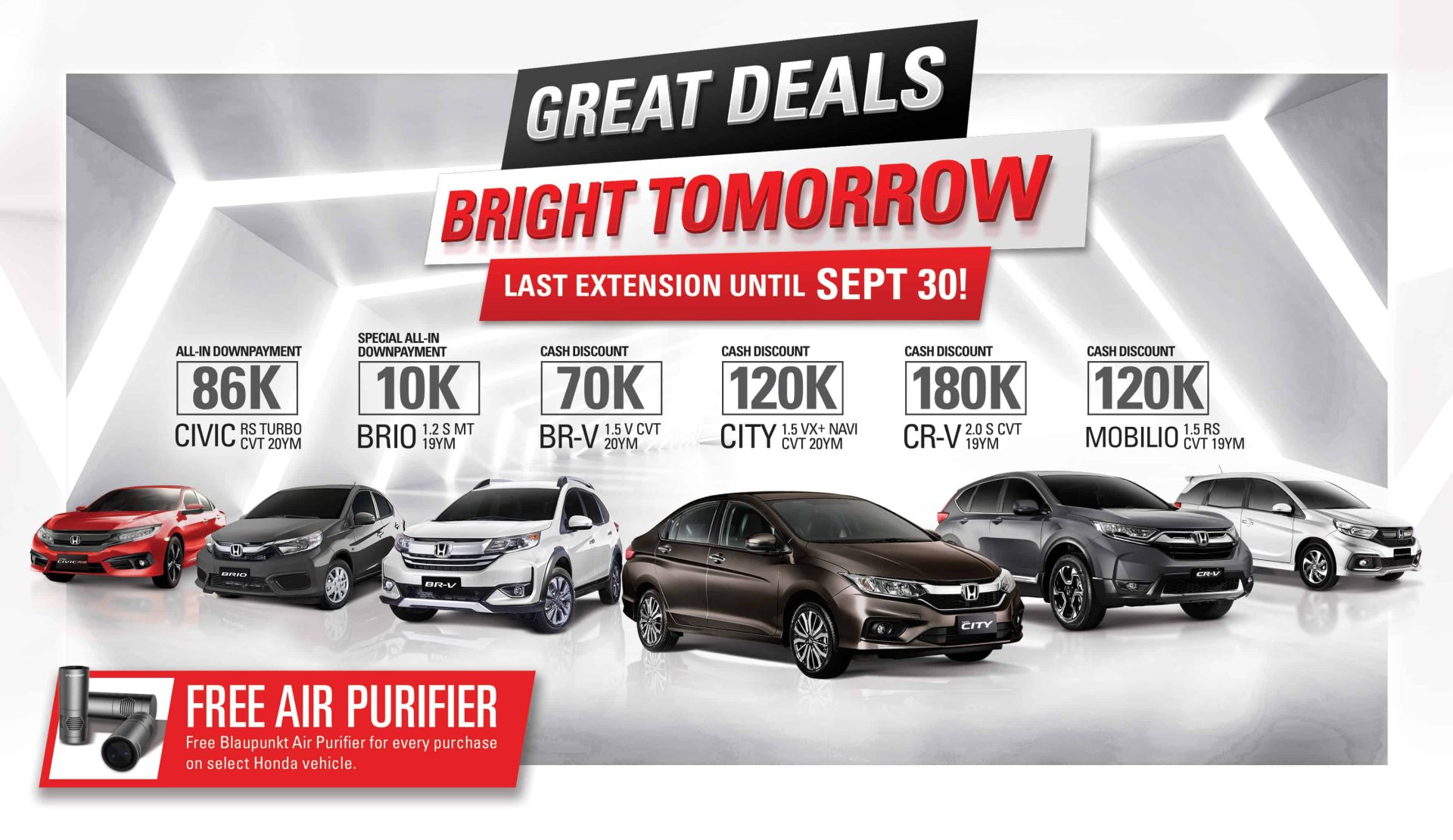 Customers who will purchase select variants of the City, Civic, CR-V, and Mobilio will also get a free Blaupunkt Air Purifier Airpure AP 1.0 set, which will provide clean air within the cabin—ensuring a safe drive during the new normal.