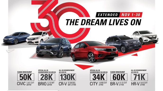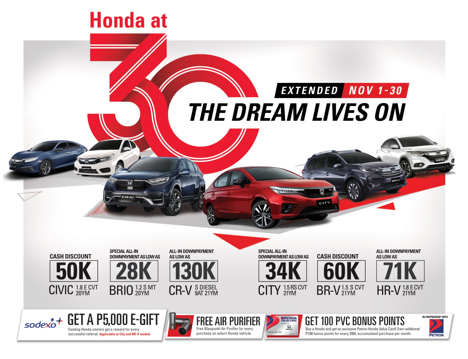 Honda Cars Philippines, Inc. (HCPI), Honda’s automobile business unit in the Philippines announces the extension of its exciting deals and special offerings under “Honda@30: The Dream Lives On” promo.