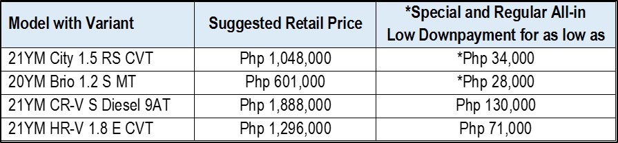 For City, Brio, CR-V, and HR-V, customers may enjoy the following special all-in and regular all-in low downpayment offers: