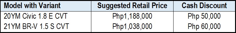 For Civic and BR-V, customers may enjoy the cash discount below: