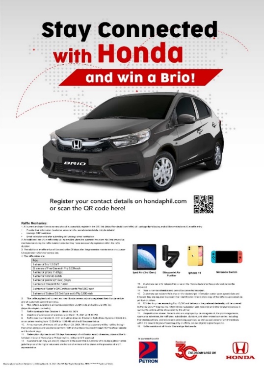 Honda car owners who have successfully registered online can get an additional e-raffle entry should they bring in their vehicle for preventive maintenance, aside from registering and providing their contact information during the e-raffle duration. The additional e-raffle coupon will be sent via email. The e-raffle draw is scheduled on March 23, 2021 and will be done via an electronic raffle draw system with the virtual presence of a DTI representative. Winning customers will be notified by HCPI through registered email or by a phone call and will be announced through HCPI’s official website and Facebook page.