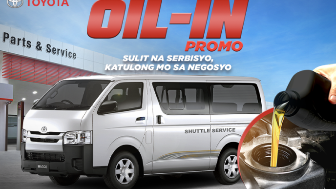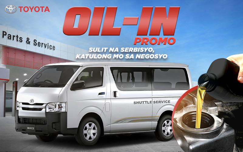 The Oil-In promo enables drivers and operators of Hiace Commuters being used in businesses to keep their vehicles running in excellent condition by using only genuine parts and materials like Toyota Genuine Motor Oil (Mineral), Toyota Genuine Oil Filter, and Toyota Genuine Drain Plug Gasket. Full promo price already includes labor cost. Promo cannot be availed together with other existing Toyota service promos.