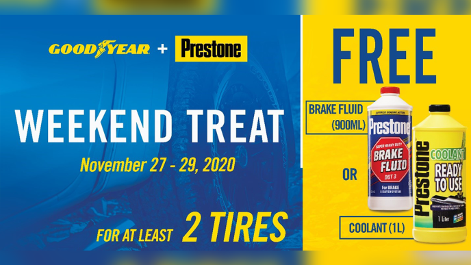 To help provide safer journeys this Christmas, Prestone and Goodyear Autocare collaborate to give motorists quality and authentic car care that you can trust. For every purchase of two Goodyear Passenger or SUV tires, motorists will be given FREE Prestone Brake Fluid 900ml or Prestone Coolant Concentrate 1L.