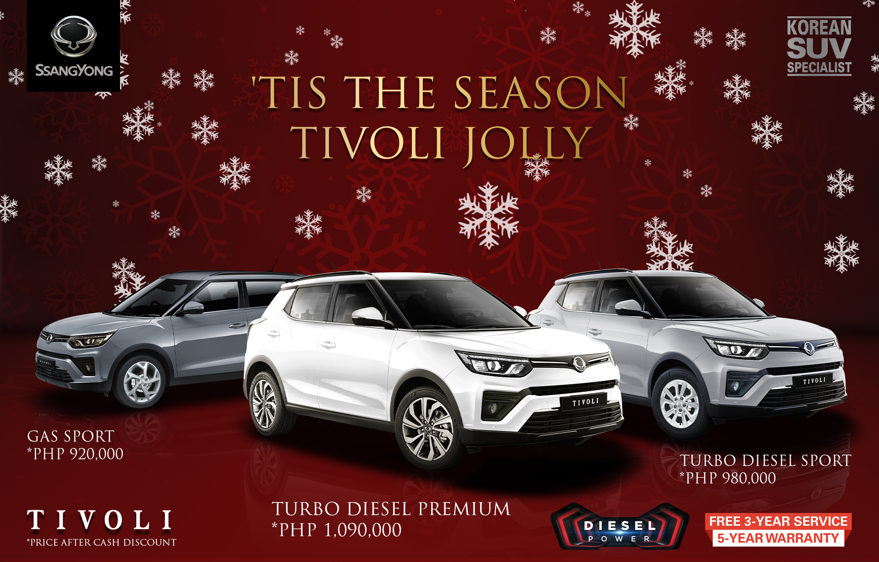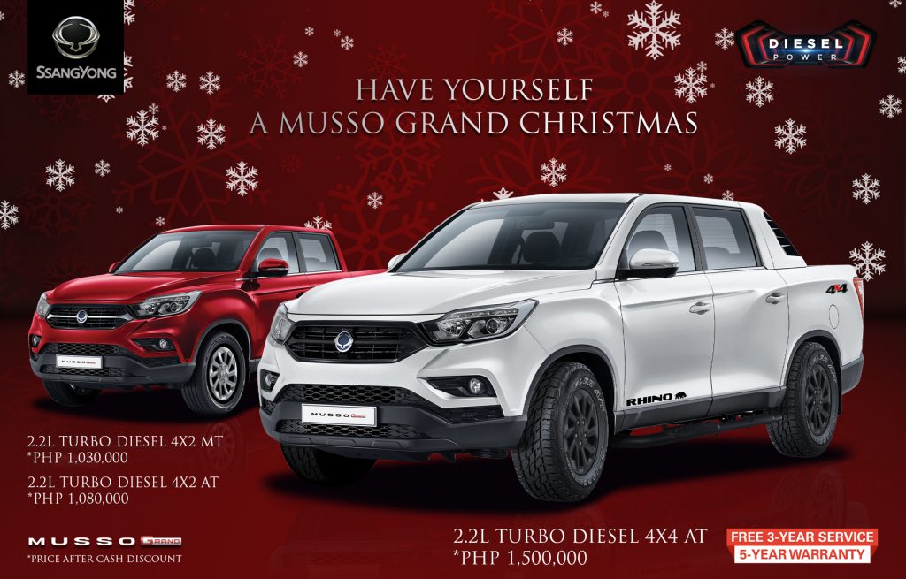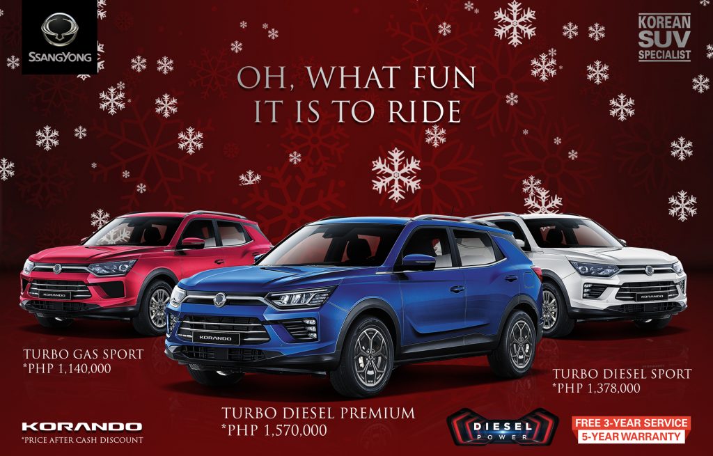 “During these trying times, SsangYong Philippines believes that purchasing a car should be the least of our customers’ worries,” says SsangYong Philippines president, Japheth Castillo. “By extending these noteworthy discounts and zero down payment offers with our standard 3-Year Free Periodic Maintenance Service and 5-Year Warranty to our customers, we can bring back the happiness associated with the Christmas season to their homes. This December, our customers will surely enjoy the sleek styling, dependable reliability and proven value of SsangYong vehicles.”