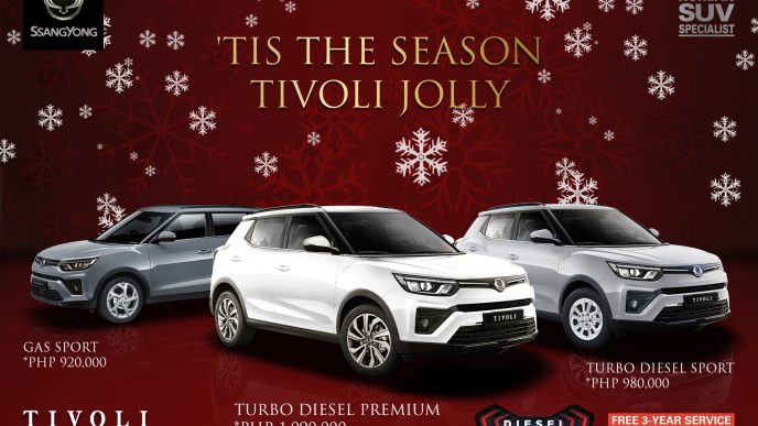 “’Tis the season Tivoli Jolly” as owning a SsangYong Tivoli is made easier than ever before this December. The SsangYong Tivoli lineup which includes the Tivoli Diesel Premium AT, the Tivoli Diesel Sport AT and the Tivoli Gas Sport AT, all receive a generous P200,000 discount from SsangYong Philippines. And to further spread the joy of Christmas to its customers, the Korean SUV Specialist will also extend similar discounts and Low to Zero Down Payment schemes to the rest of its model lineup.