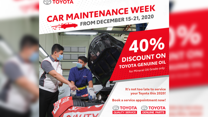During Toyota’s Car Maintenance Week, all Toyota customers who will avail of Periodic Maintenance (PM) or Express Maintenance (EM) service at any Toyota dealership across the country will automatically receive 40% discount on Toyota Genuine Motor Oil- Mineral Grade.