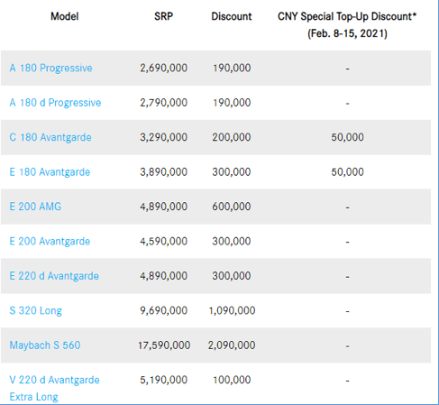 Get as much as P600,000 cash savings on the E 200 AMG, P200,000 cash discounts on the C180 Avantgarde and P300,000 price off on E 180 Avantgarde. And there’s more! Reserve your C180 Avantgarde and E 180 Avantgarde on Feb 8-15, 2021, and avail of the Chinese New Year Special top-up discount of P50,000.