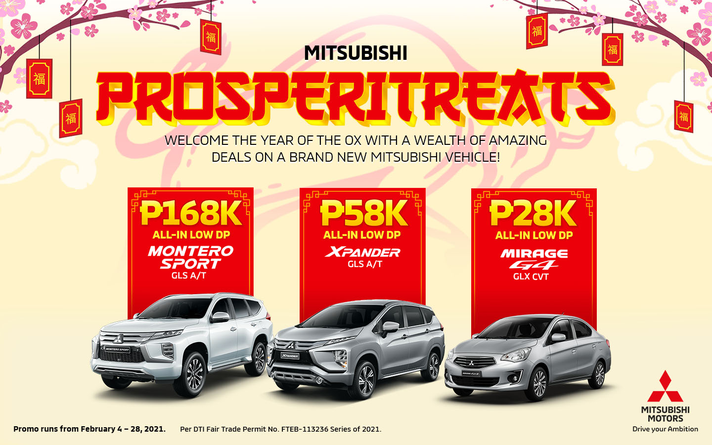 In line with the upcoming Chinese New Year celebration this month of February, Mitsubishi Motors Philippines Corporation (MMPC) welcomes the festivity with the Mitsubishi “Prosperitreats” promo. Customers may avail of low-down payment offers for the Mitsubishi Montero Sport, Xpander and Mirage G4.