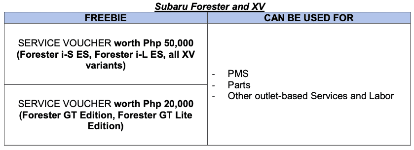 On top of the cash discounts available for all variants of the Subaru Forester and all variants of the Subaru XV, Subaru is extending the additional service voucher promo to purchases of the said models for this month