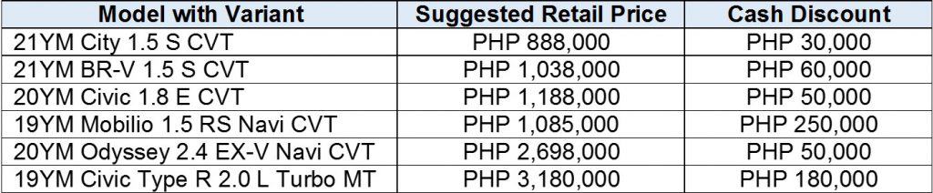 For City, BR-V, Civic, Mobilio, Odyssey, and Civic Type R, customers may enjoy the cash discounts below: