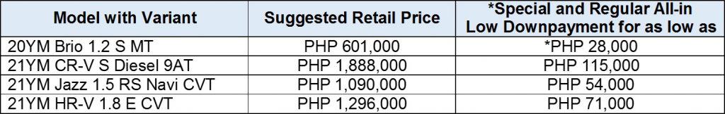 For Brio, CR-V, Jazz, and HR-V, customers may avail of the following special all-in and regular all-in low downpayment offers: