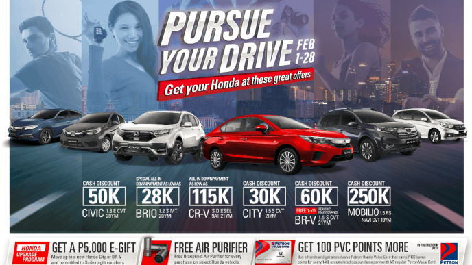 Honda Cars Philippines, Inc. (HCPI), Honda’s automobile business unit in the Philippines launches its promotion for this month entitled “Pursue Your Drive”. The promo features cash discounts, exciting deals and special offers from February 1-28, 2021, including a 250K discount for the brand new old stock Mobilio.