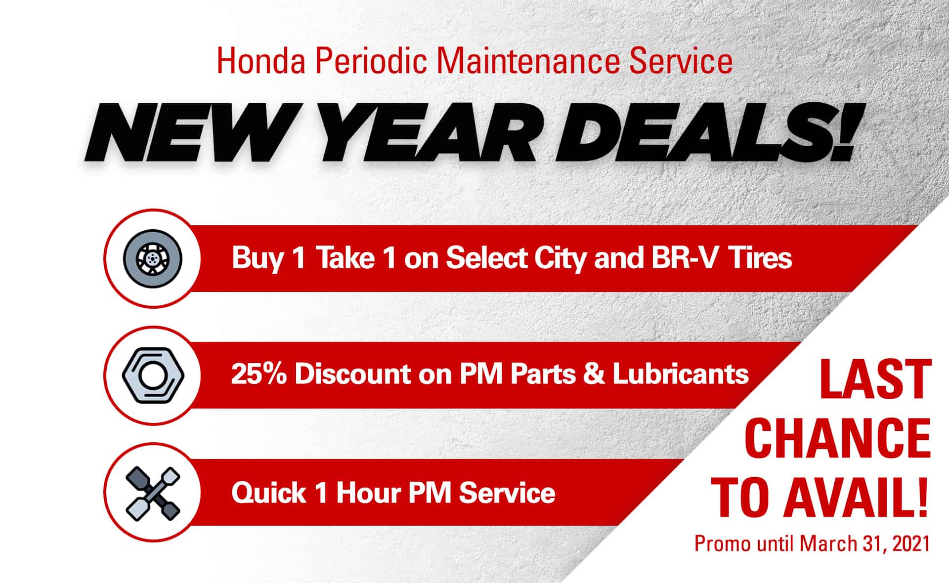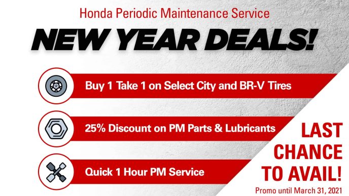 Honda Cars Philippines, Inc. (HCPI) Honda’s automobile business unit in the Philippines, reminds customers of their last chance to avail the “Honda PM Service New Year Deals” promo, which features different discounts and deals offered until March 31, 2021 at select Honda Cars dealerships and service centers nationwide.