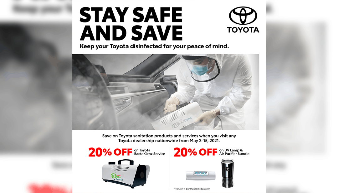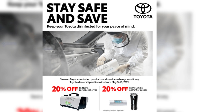 In order to help Filipinos move forward, Toyota is offering customers up to 20% in savings on selected sanitation products and services in all Toyota dealerships nationwide from May 3 to 15, 2021.