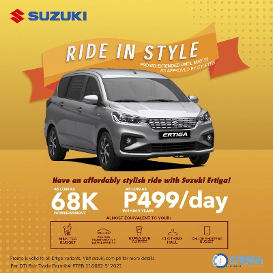 Have an affordably stylish ride with the Suzuki Ertiga for as low as Php 499/day (within 5 years) and down payment as low as Php 68,000– practically just equivalent to your milk tea budget, online shopping budgets, expensive coffees, clothing hauls and a one-time transportation service booking. Promo extended until May 31, 2021.