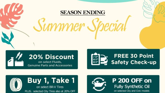Customers may enjoy a 20% discount on select genuine parts, lubricants, fluids, and accessories such as PM 2.5 cabin filter, regular cabin filter, spark plug, battery, brake pad, brake shoe, super long life coolant, automatic transmission fluid, manual transmission fluid, power steering fluid, HCF-2 CVTF fluid, brake fluid, and our existing additives such as engine cleaner and engine oil treatment. In addition, a PHP 200 discount will also be provided to customers who will purchase a Honda fully synthetic oil (0W-20) during their preventive maintenance for City and Civic, with year models 2017 and below.