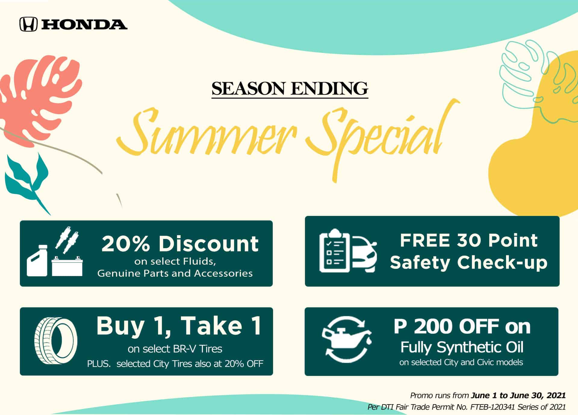 Honda Cars Philippines, Inc. (HCPI), Honda’s automobile business unit in the Philippines, announces its “Season Ending Summer Special” promo, which features different discounts and deals offered until June 30, 2021 at select Honda Cars dealerships and service centers nationwide.