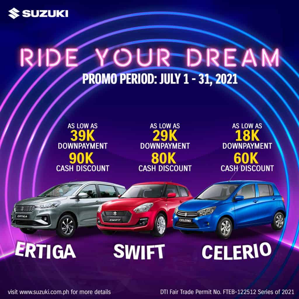 The Ride Your Dream promo is applicable to all Suzuki Auto dealers nationwide. Promo period is from July 1 to July 31, 2021 only, so hurry and don’t let this opportunity pass!