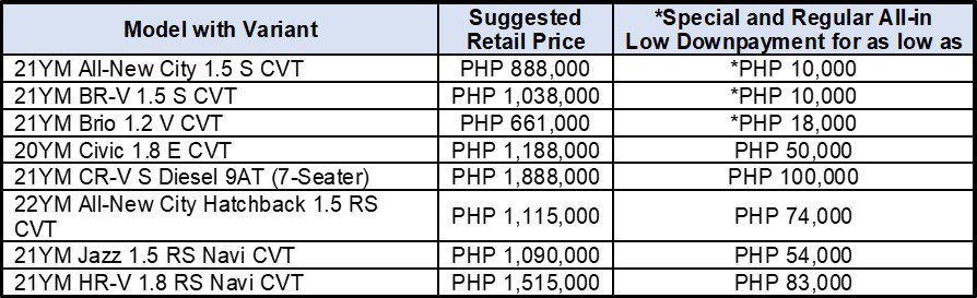 For the All-New City, BR-V, Brio, Civic, CR-V, All-New City Hatchback, Jazz, and HR-V, customers may avail the following special all-in, and regular all-in low downpayment offers: