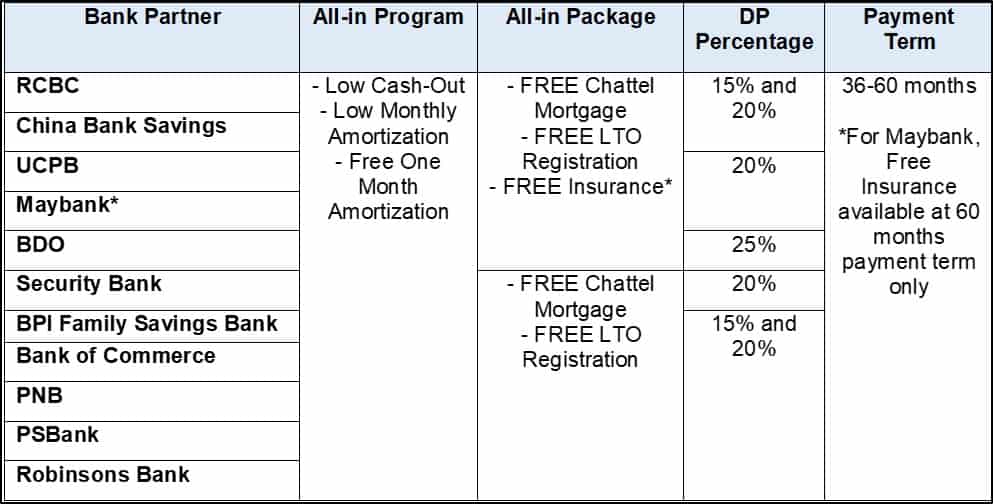 All these offers include a three (3) year LTO Registration and Chattel Mortgage and a free one (1) year Comprehensive Insurance with Acts of Nature through select bank partners.