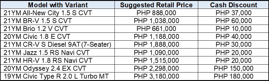 For the All-New City, BR-V, Brio, Civic, CR-V, Jazz, HR-V, Odyssey, and Civic Type R, these are the cash discounts customers can enjoy: