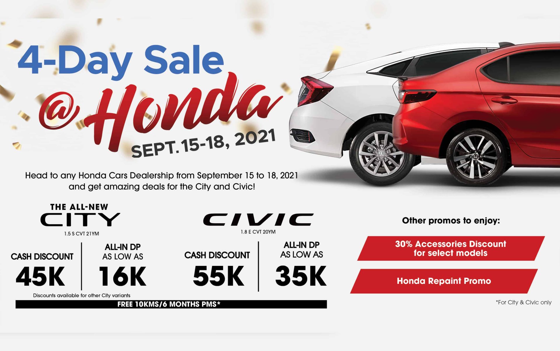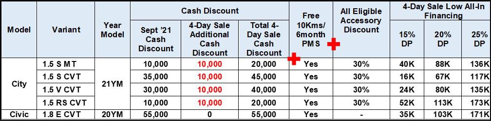 On top of any on-going cash promotions, from September 15 to 18, all 21YM All-New City (sedan) customers may avail an additional PHP 10,000 cash discount.