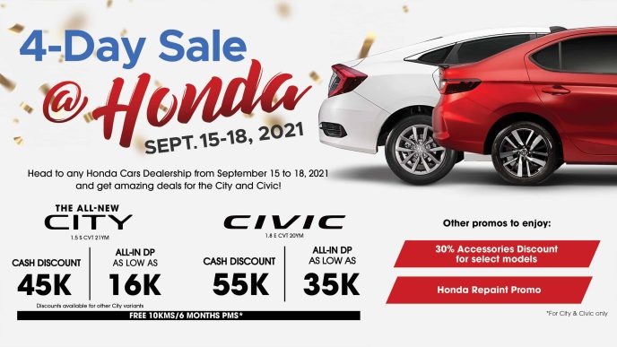 Honda Cars Philippines, Inc. (HCPI), Honda’s automobile business unit in the Philippines has announced the additional cash discounts, low financing offers, participating models, and exclusive deals under its 4-Day Sale this September 15 to 18 2021.