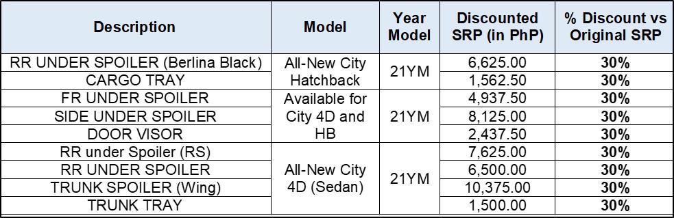 Aside from new vehicle promos and discounts, customers may avail 30% off on select car accessories until September 30, 2021. For 21YM All-New City (sedan), 30% discount is available for Front Under Spoiler, Side Under Spoiler, Door Visor, Rear Under Spoiler, Trunk Spoiler, and Trunk Tray. On the other hand, for 21YM All-New City Hatchback, the discount is applicable for Rear Under Spoiler (Berlina Black), Cargo Tray, Front Under Spoiler, Side Under Spoiler, and Door Visor.