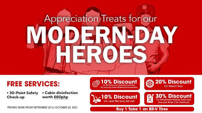 Honda Cars Philippines, Inc. (HCPI) Honda’s automobile business unit in the Philippines announces its Modern-Day Heroes promo. This special deal runs from September 20 to October 20, 2021, at select Honda Cars authorized dealerships.