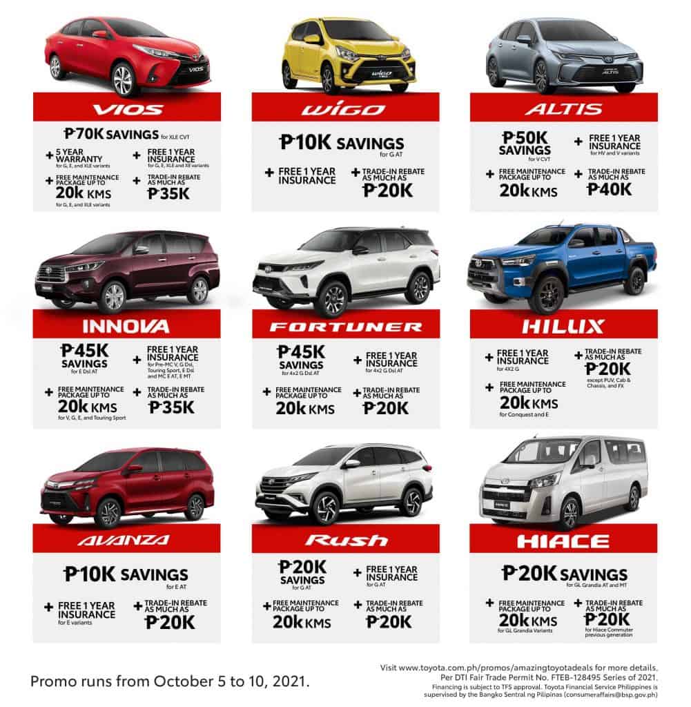 On top of these offers, customers looking to trade in their old vehicle for a Toyota can get up to a P40,000 rebate which can be used to purchase accessories or availed with other existing offers.