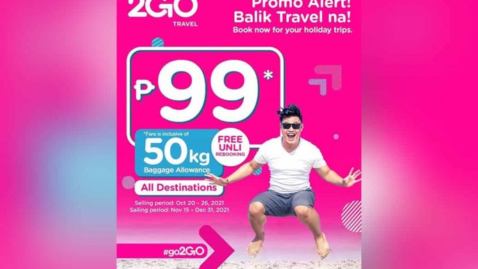 In support of the above easing of travel restrictions, 2GO Travel launched the ₱99 promo inclusive of 50kg baggage allowance and free unlimited rebooking. Passengers can avail of the promo from October 20 to 26, 2021 for sailing on November 15 to December 31, 2021. Fully vaccinated passengers will enjoy a 10% discount on non-promo tickets purchased from 2GO stores.