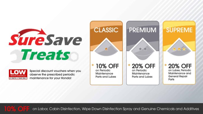 All Sure Save Treats voucher holders are entitled to a 10% discount on cabin disinfection and wipe down disinfection spray, accessories, and Honda genuine chemicals and additives. Furthermore, customers who still hold previous Topaz, Ruby, and Diamond Sure Save vouchers may still use them.