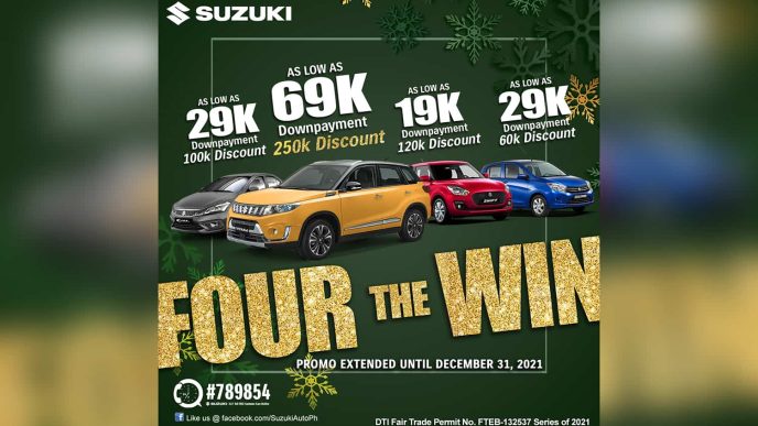 Suzuki Philippines (SPH) makes this holiday session merrier as customers eyeing to get their very own Suzuki vehicle are a step closer to their dream with the Four the Win Promo! This is SPH’s last promo offering for 2021 before they welcome 2022 with many more promos and discounts ending the year festively and welcoming the next year with a bang!