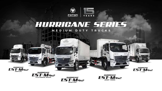 All equipped with dependably strong US-made Cummins Diesel Engines, generous cash discounts are applicable for Hurricane EST-M 4X2(22ft) with body options including Cab and Chassis, F-Van, Wing Van, Dropside; Hurricane EST-M 4×2(25ft) with body options including the Cab and Chassis, Telescopic Crane, F-Van, Wing Van and the segment’s toughest Dump Truck.