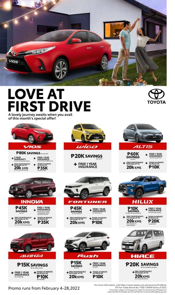 There’s nothing you can drive that can’t be driven. Especially when it’s a Toyota! That’s why this February, Toyota Motor Philippines (TMP) is set to offer one-of-a-kind deals to experience falling in love with the joys of driving a Toyota. Customers can avail offers to take home a new car through light monthly payment option, low all-in payment, cash discounts, plus free periodic maintenance service, free insurance, and more! Get yours now and discover how owning a Toyota is a many-splendored thing.