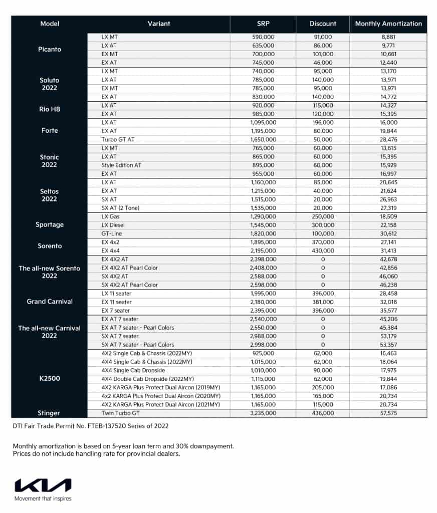 Kia Philippines is also offering 20% and 30% down payment terms with a 36 to 60-month term period as part of its Low Monthly Payment Program. Participating banks include BDO, BPI Family Savings, Chinabank Savings, East West Bank, PNB Savings, PS Bank, RCBC, and Security Bank.