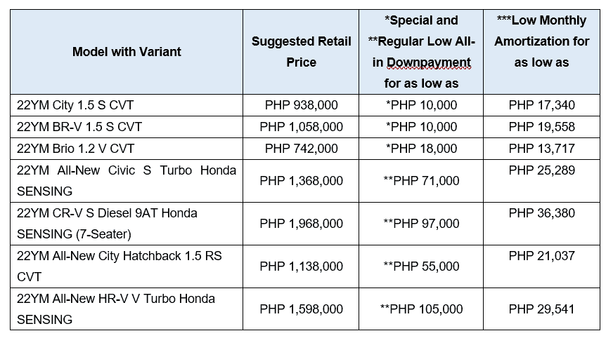 All these offers include a three (3) year LTO Registration and Chattel Mortgage, and a free one (1) year Comprehensive Insurance through select bank partners. Customers may submit their bank loan applications online at www.hondaphil.com via the auto loan link page for select bank partners, subject to the preferred bank’s approval.