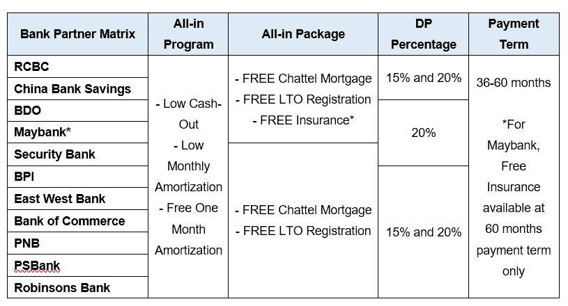 Customers are also entitled to different financing promo offers such as low cash-out, low monthly amortization, free one (1) month amortization at 15%, and 20% all-in downpayment offers, available with the following bank partners: