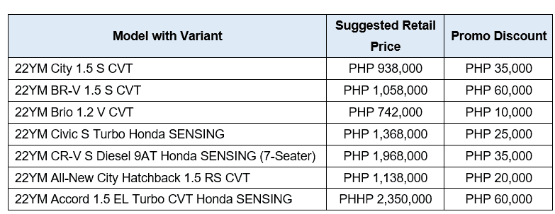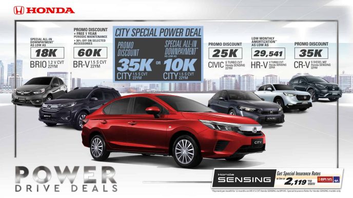 Honda Cars Philippines, Inc. (HCPI) continues its month-long offering of the latest deals and special offers on select models and accessories under the ‘Power Drive Deals’ promo. From July 1-31, 2022, customers may bring home their new Honda vehicle and enjoy different cash discounts, low all-in downpayment, low monthly amortization, flexible financing options, and other exclusive offerings.