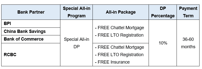 A special, all-in financing program applicable for 10% downpayment with 36-60 months payment terms is also offered for select models: