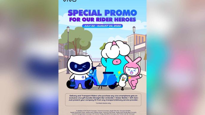 Starting July 22, 2022 until August 22, 2022, they can get an exclusive vivo gift bundle to help them through their deliveries. This includes Straight Bar Umbrella, Water Bottle, and Gift Set that they can claim for every purchase of any vivo smartphones at SM North Concept, Trinoma Concept, Ayala FairviewTerraces Exhibit, Ayala Clover Leaf Kiosk, WalterMart Makati Kiosk, Century City Kiosk, Ayala Mall Bay Concept, SM Sangandaan Concept, SM Center Pasig, Glorietta Concept, or Fishermall QC Concept.