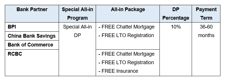 A special, all-in financing program applicable for 10% downpayment with 36-60 months payment terms is also offered for select models: