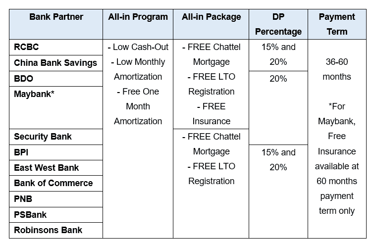 Customers are also entitled to different financing promo offers such as low cash-out, low monthly amortization, free one (1) month amortization at 15%, and 20% all-in downpayment offers, available with the following bank partners: