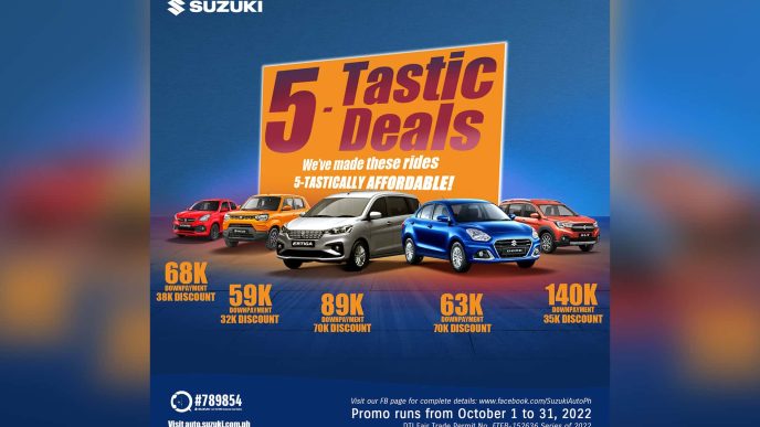 Patrons can now enjoy Suzuki’s 5-tastic Deals Promo and bring home any of Suzuki’s 5 fanfavorite models at low downpayment prices and cash discounts, up until the 31st of October,