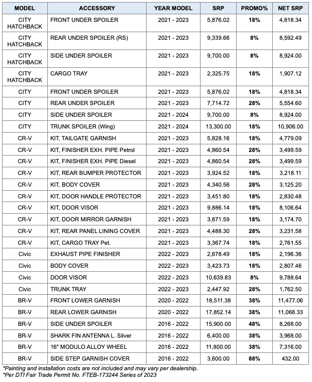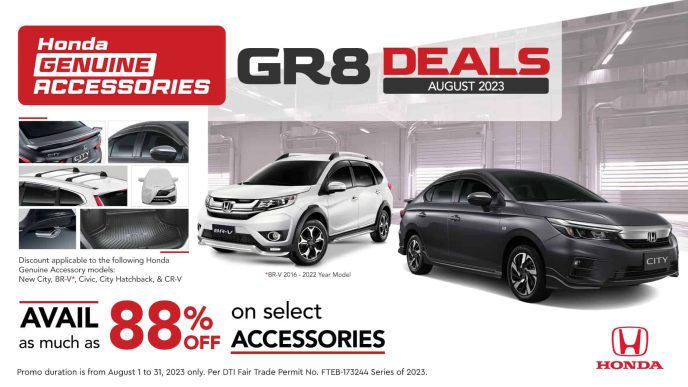 Honda Cars Philippines, Inc. (HCPI) is delighted to extend an exclusive invitation to customers seeking to dress up or personalize their Honda vehicles. Avail huge savings of up to 88% offered on select Honda Genuine Accessories until August 31, 2023.